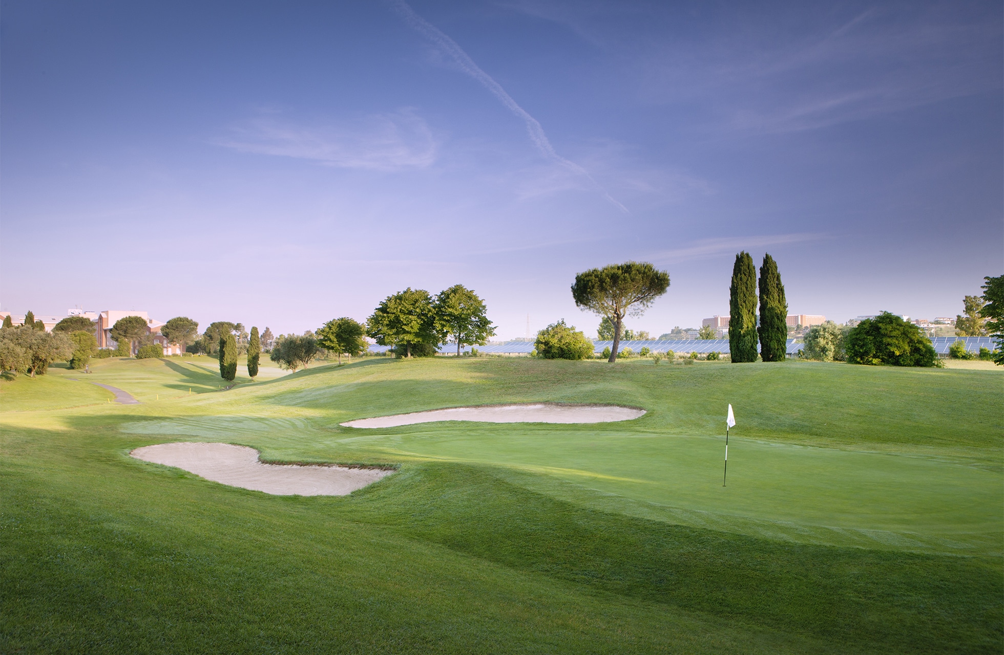 Greenområdena är väldesignade med snabba och lagom ondulerade greener. Låghandicapparen trivs med de utmanande greenområdena där varje attack på flaggan kräver precision. Medel- och höghandicapparen har å andra sidan ofta stora ytor att landa bollen på, och kan njuta av de vackra vattenhindren. Det finns flera fina hål som aspirerar på att vara signaturhål men hål 18 är lite speciellt. Det är ett svagt dogleg där man riskerar att hamna mitt i en antik romersk gravplats. Inspelet är nervkittlande då greenen syns från klubbhuset och omgärdas av både vatten och bunkrar. 18-hålsbanan är som sagt en utmaning att spela. Percorso Rosso, 9-hålsbanan, är något kortare och ett bra komplement till den lite mer utmanande mästerskapsbanan. Det är tur att vi har bakat in obegränsad greenfee i resans pris. Det här är en bana du vill spela om och om igen!
